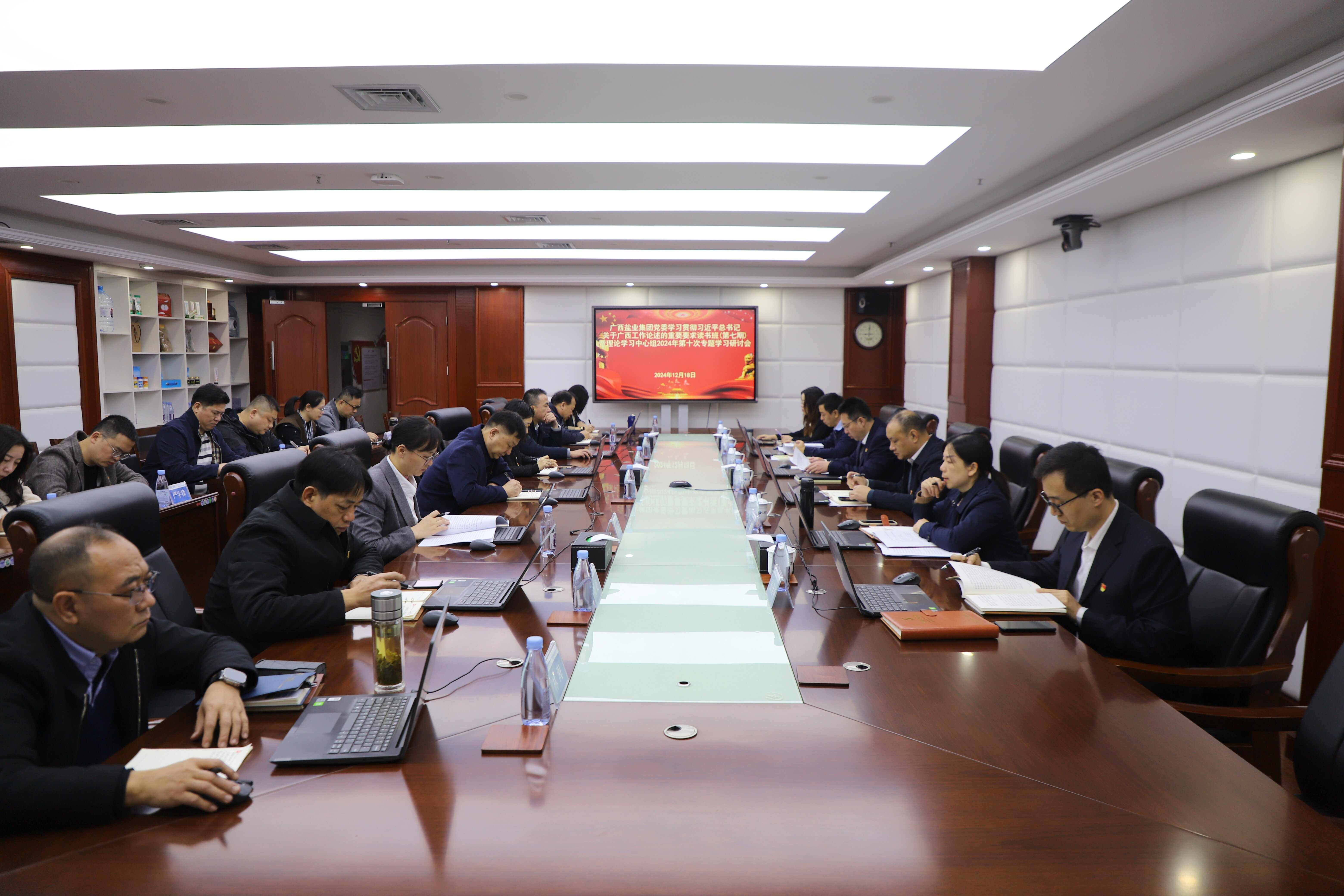 2024年12月18日,廣西鹽業(yè)集團(tuán)黨委召開學(xué)習(xí)貫徹習(xí)近平總書記關(guān)于廣西工作論述的重要要求讀書班(第七期)暨理論學(xué)習(xí)中心組2024年第十次專題學(xué)習(xí)研討會(huì),原文學(xué)習(xí)《習(xí)近平關(guān)于廣西工作論述摘編》,廣西鹽業(yè)集團(tuán)黨委書記、董事長(zhǎng)邱潮涌主持會(huì)議并講話。