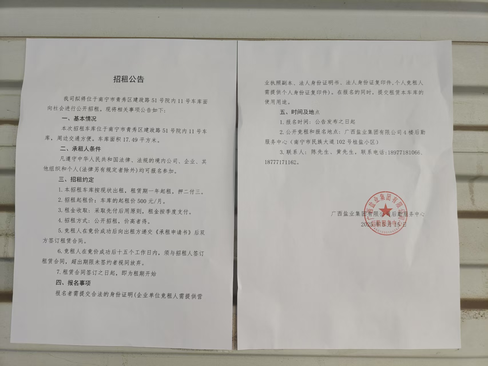 我司擬將位于南寧市青秀區(qū)建政路51號院內(nèi)11號車庫面向社會進(jìn)行公開招租?,F(xiàn)將相關(guān)事項(xiàng)公告如下: